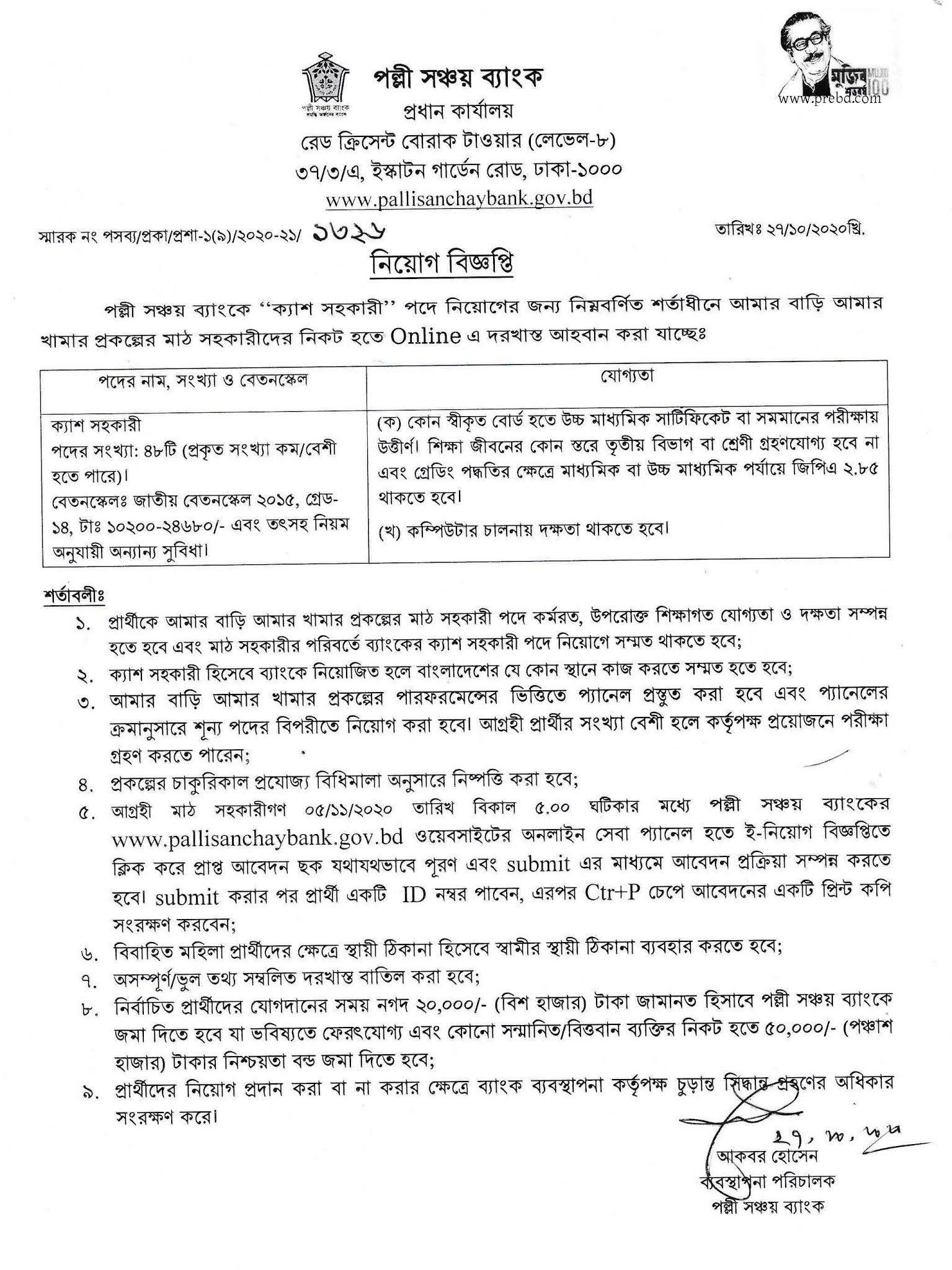 পল্লী সঞ্চয় ব্যাংক এ নিয়োগ বিজ্ঞপ্তি 2020 পল্লী সঞ্চয় ব্যাংকে ক্যাশ সহকারী পদে নিয়োগের জন্য নিম্নবর্ণিত শর্তাদীনে আমার বাড়ি আমার খামার প্রকল্পের মাঠ সহকারীদের নিকট হতে online এ দরখাস্ত আহবান করা যাচ্ছেঃ বিস্তারিত জানতে