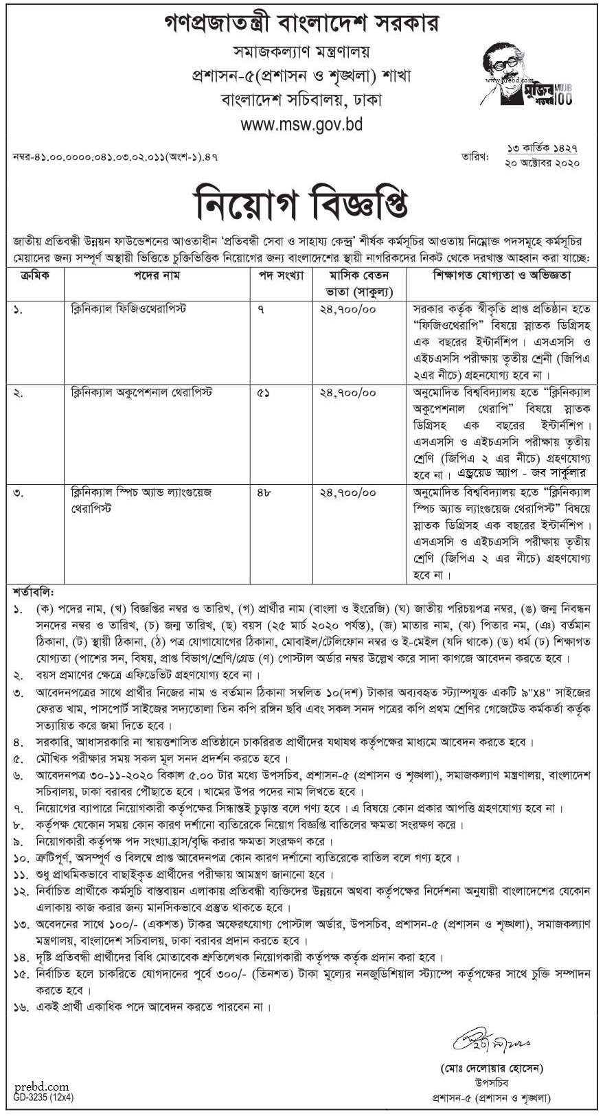 জাতীয় প্রতিবন্ধী উন্নায়ন ফাউন্ডেশনের প্রতিবন্ধী সেবা ও সাহায্য কেন্দ্র শীর্ষক কর্মসূচির আওতায় নিম্নোক্ত পদসমূহের কর্মসূচির মেয়াদের জন্য সম্পূর্ণ অস্থায়ী ভিত্তিতে চুক্তিভিত্তিক নিয়োগের জন্য বাংলাদেশের স্থায়ী নাগরিকদরে নিকট থেকে দরখাস্ত আহবান করা যাচ্ছে।