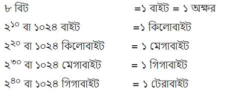 কম্পিউটার স্মৃতির ধারণক্ষমতা নির্ণয়ের বৃহৎ একক গুলো হল : কিলোবাইট, মেগাবাইট, গিগাবাইট ও টেরাবাইট। নিচে এদের মধ্যে সম্পর্ক দেখানো হল :